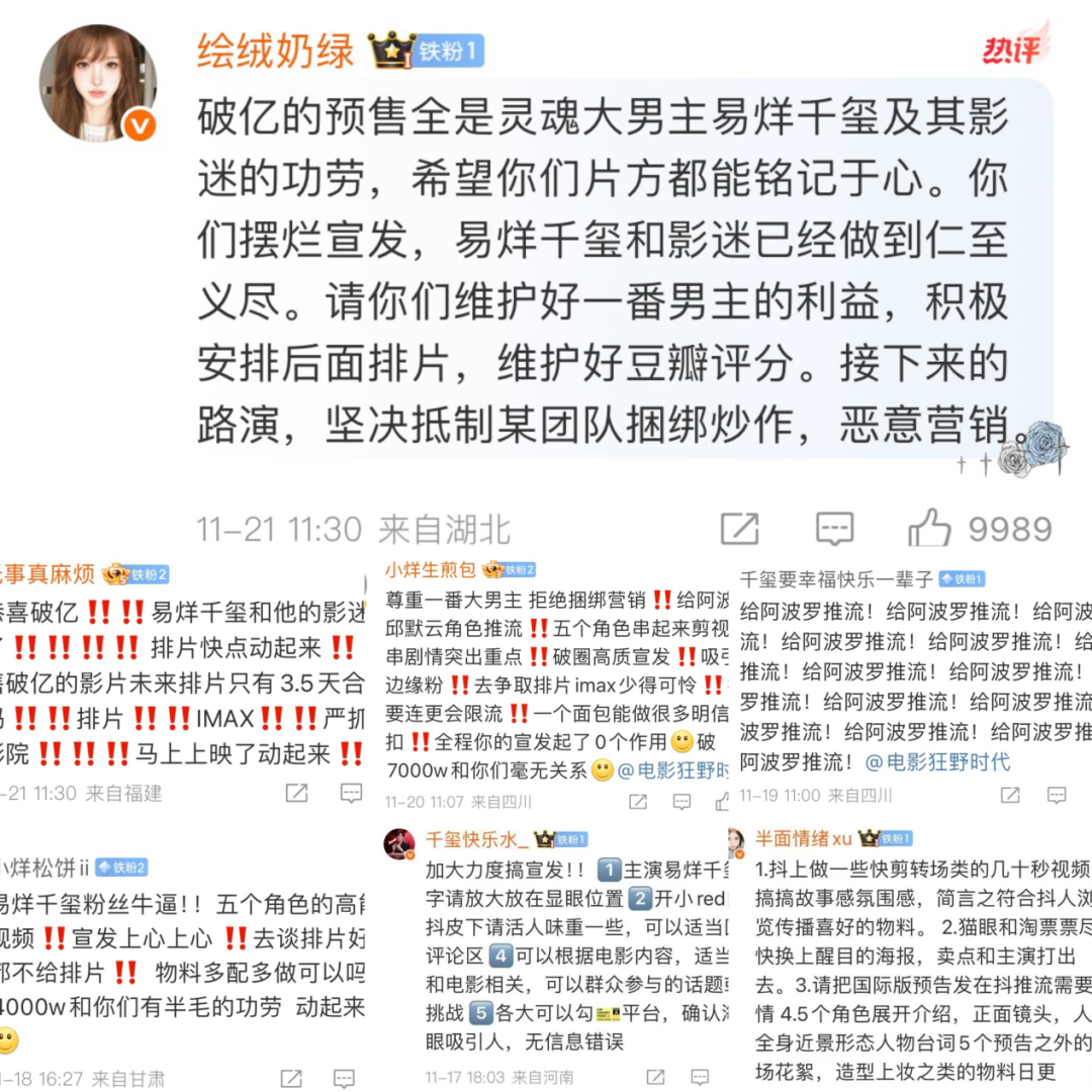 然而官微一张张预售战报下,少有路人的祝福和期待,多的是“千纸鹤”(易烊千玺粉丝)对营销策略的指导,直白地指出让其放下身段,放大卡司阵容,撕排片、冲业绩:“给阿波罗投抖+”、“能不能不装了”、“跟某些所谓国际知名导演、制片有0关系”、“把千玺获奖感言推荐狂野时代那里剪出来在抖推流,金鸡现在热度特别大,你们速速去蹭!!”
